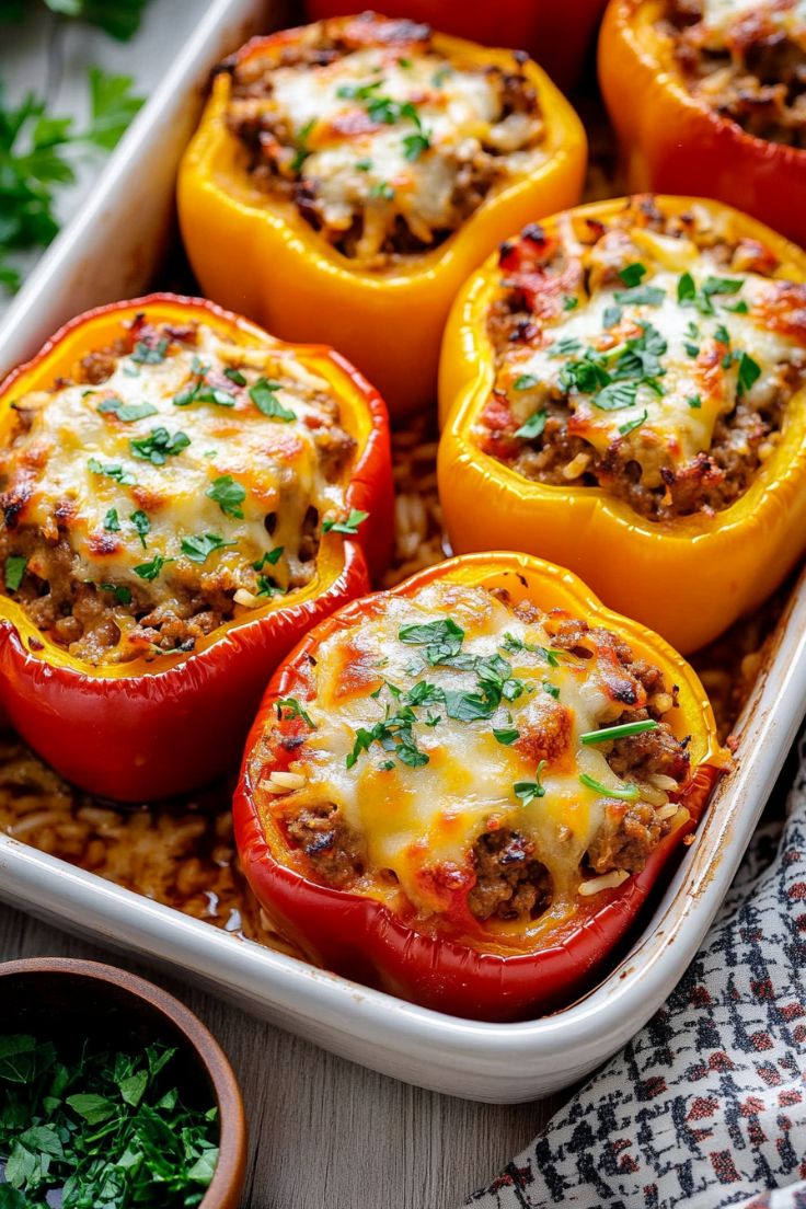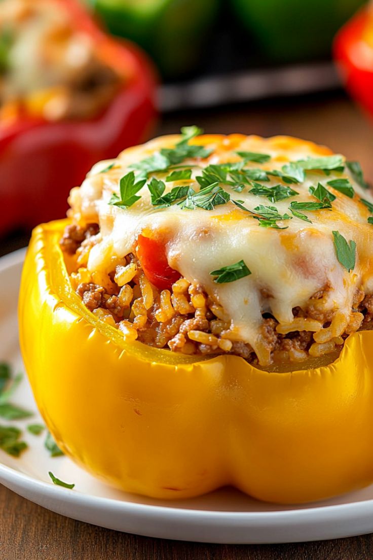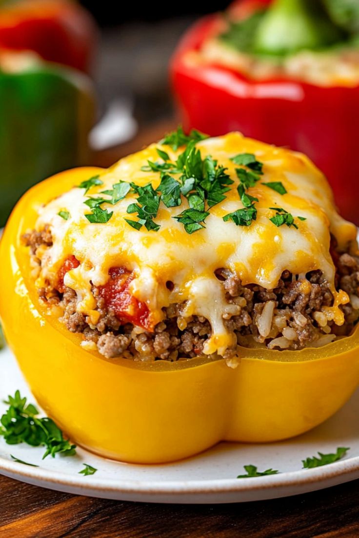 These cheesy stuffed bell peppers are filled with a rich, savory mix of seasoned beef, tomato sauce, and tender rice, then topped with melty mozzarella for the ultimate comfort food experience.