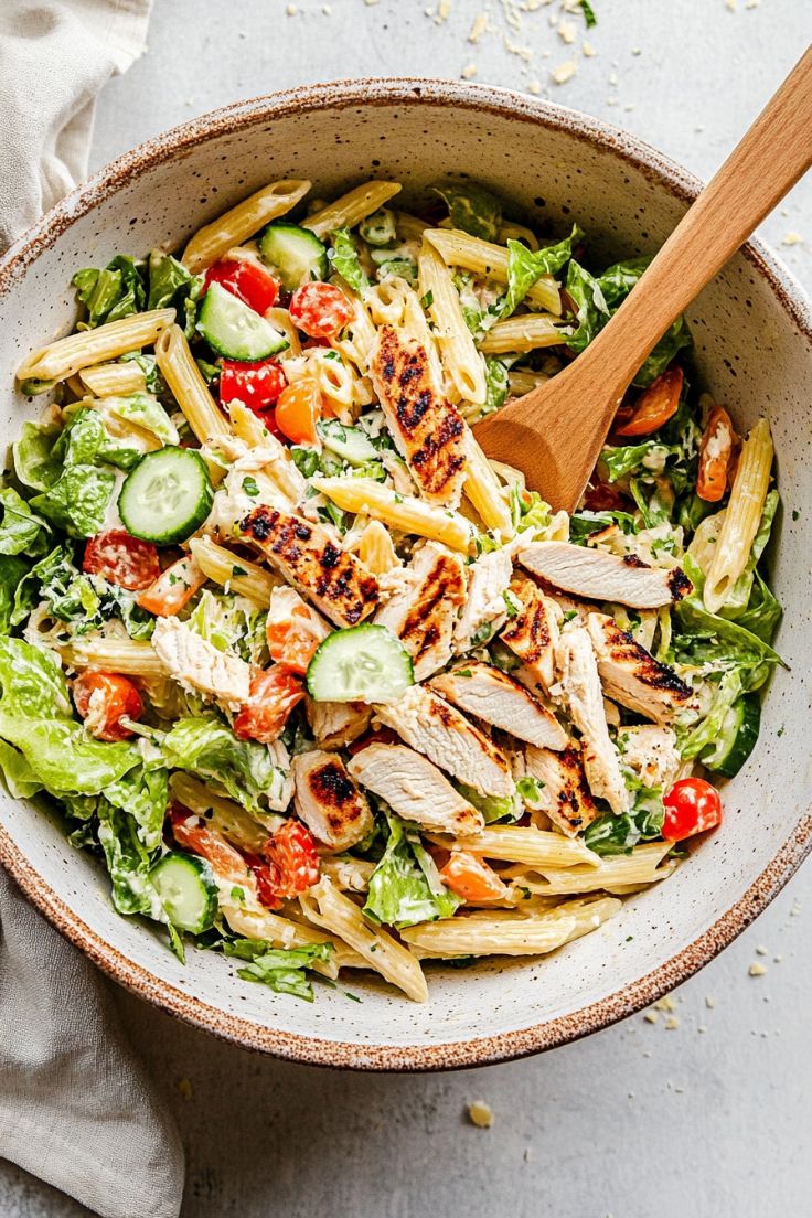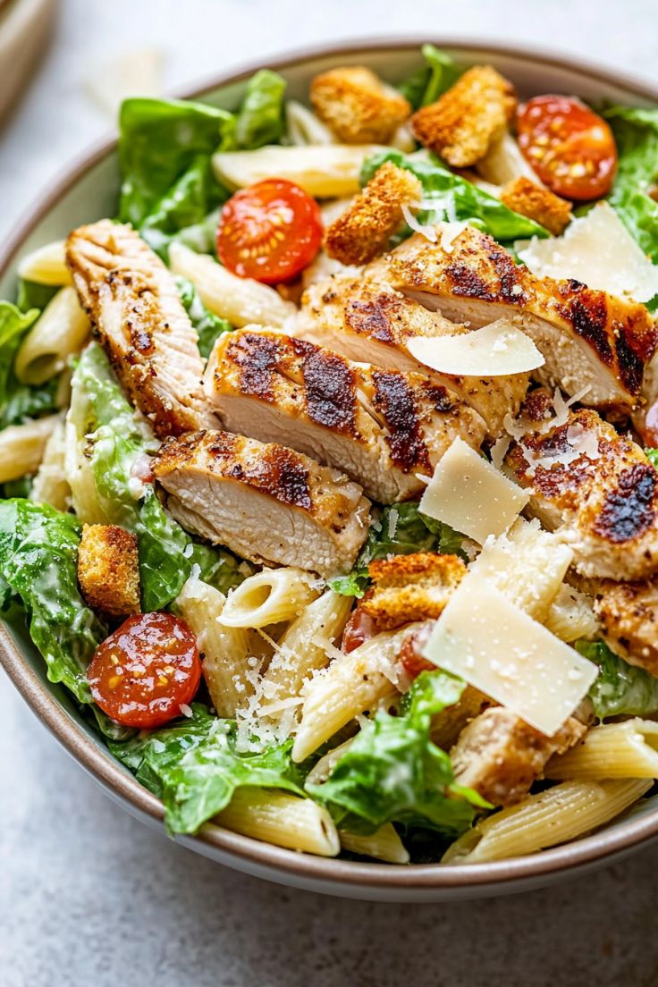 Juicy grilled chicken, crisp romaine, cherry tomatoes, and crunchy croutons meet perfectly cooked pasta, all tossed in a rich, creamy Caesar dressing.