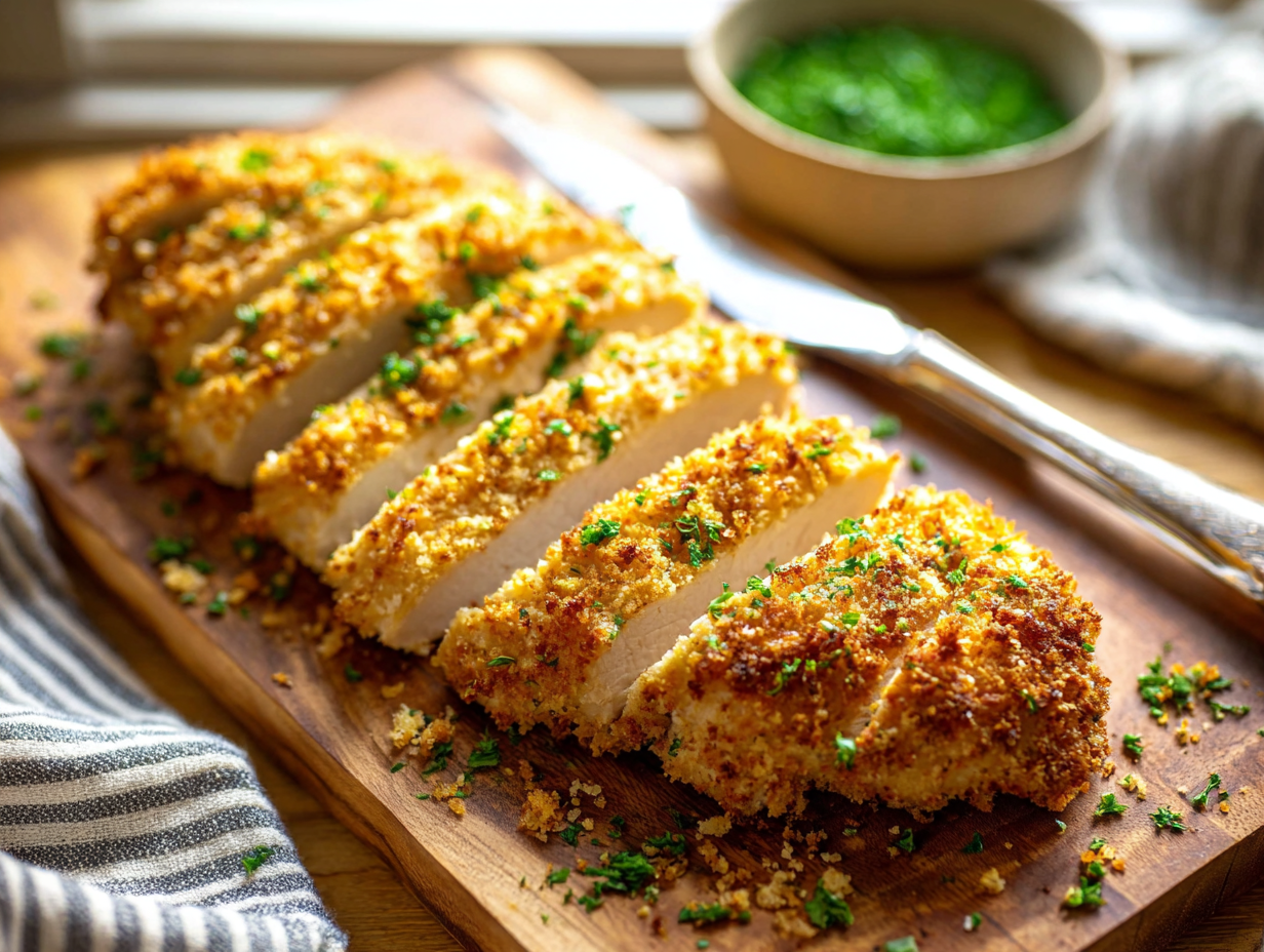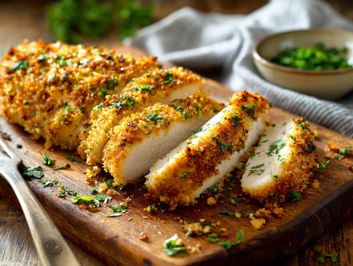Golden on the outside and tender in the center, this baked chicken features a crisp coating made from buttery panko, Parmesan, and herbs. It delivers that satisfying crunch without frying and comes together quickly for an easy dinner option. Pair it with vegetables, pasta, or a fresh salad for a complete meal.