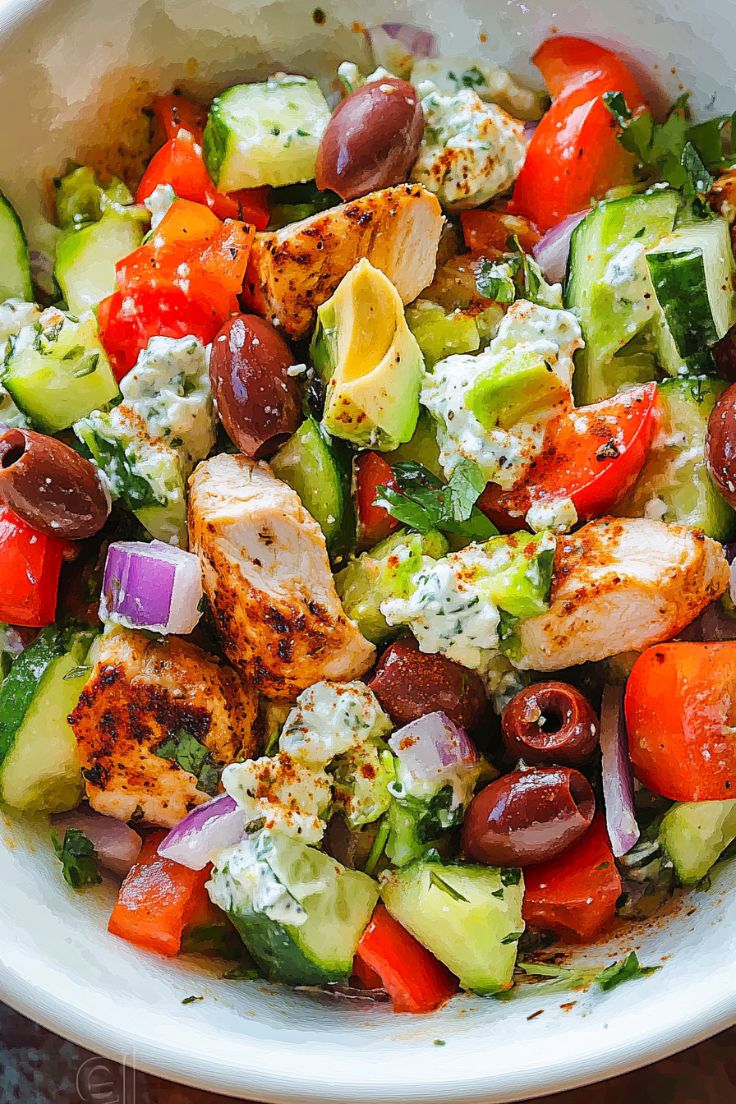 This Greek Chicken Bowl combines the best of Greek salad—juicy tomatoes, crisp cucumbers, briny olives, and creamy feta—paired with tender, marinated chicken and a refreshing tzatziki sauce.