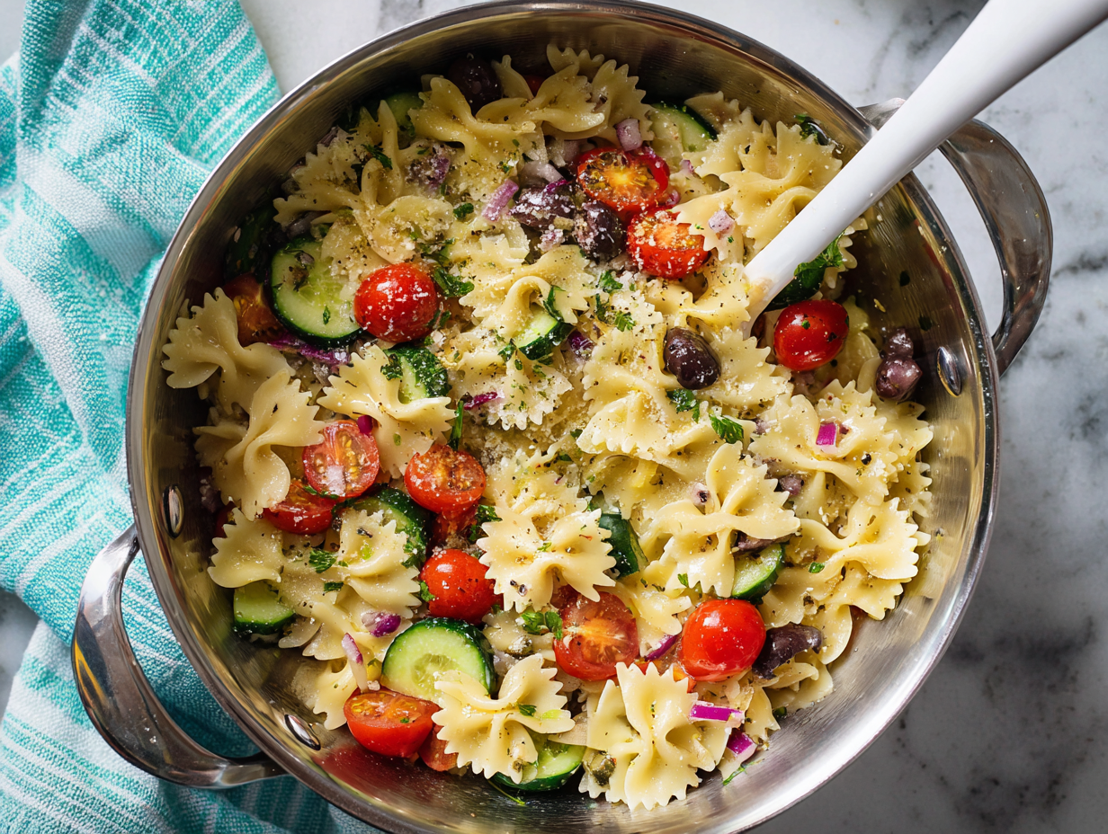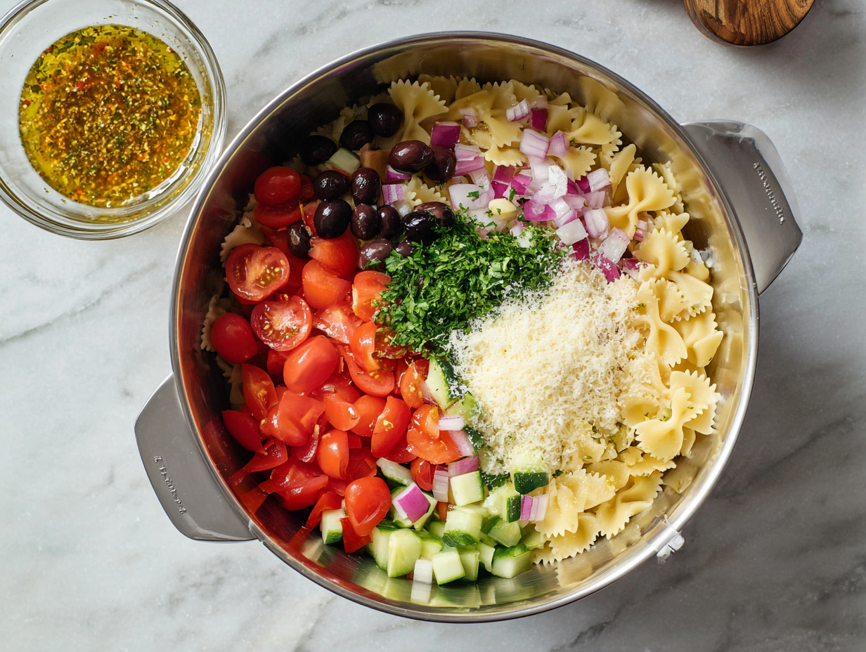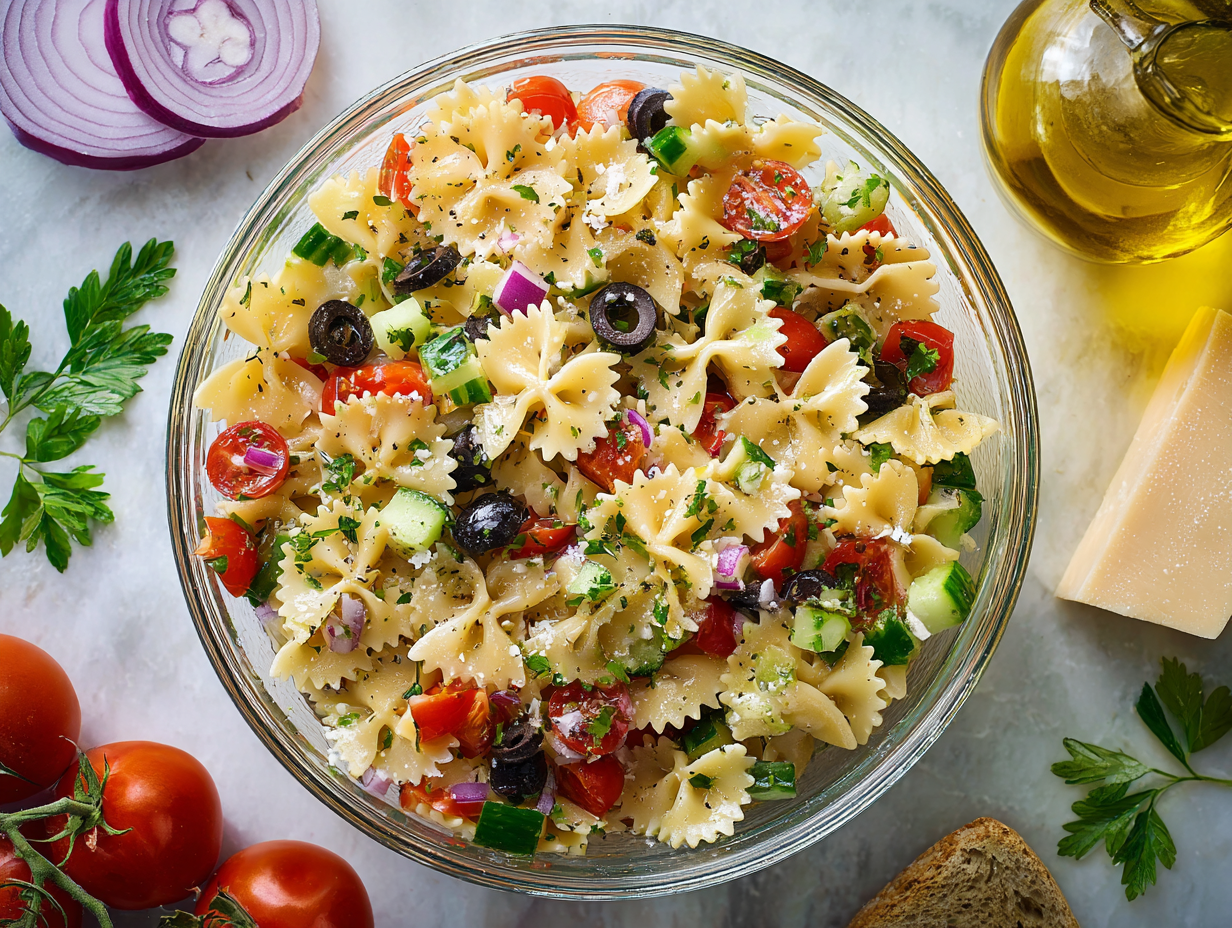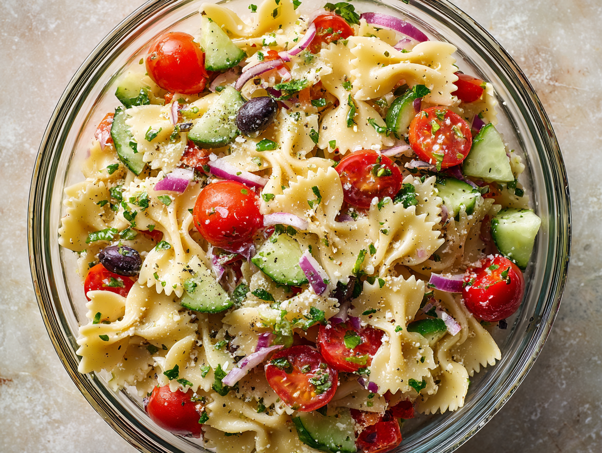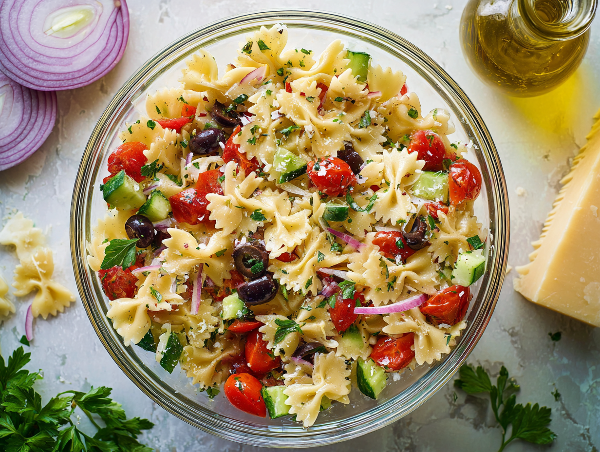 A colorful pasta salad featuring tender bow tie pasta, crisp vegetables, briny olives, and a simple homemade Italian dressing. Finished with grated parmesan and fresh parsley, it’s perfect for gatherings or everyday meals.