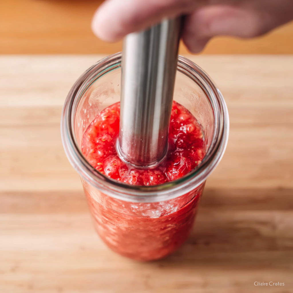 Place the sliced strawberries at the bottom of a glass. Mash them thoroughly using a muddler until they release their juices. - Step 2