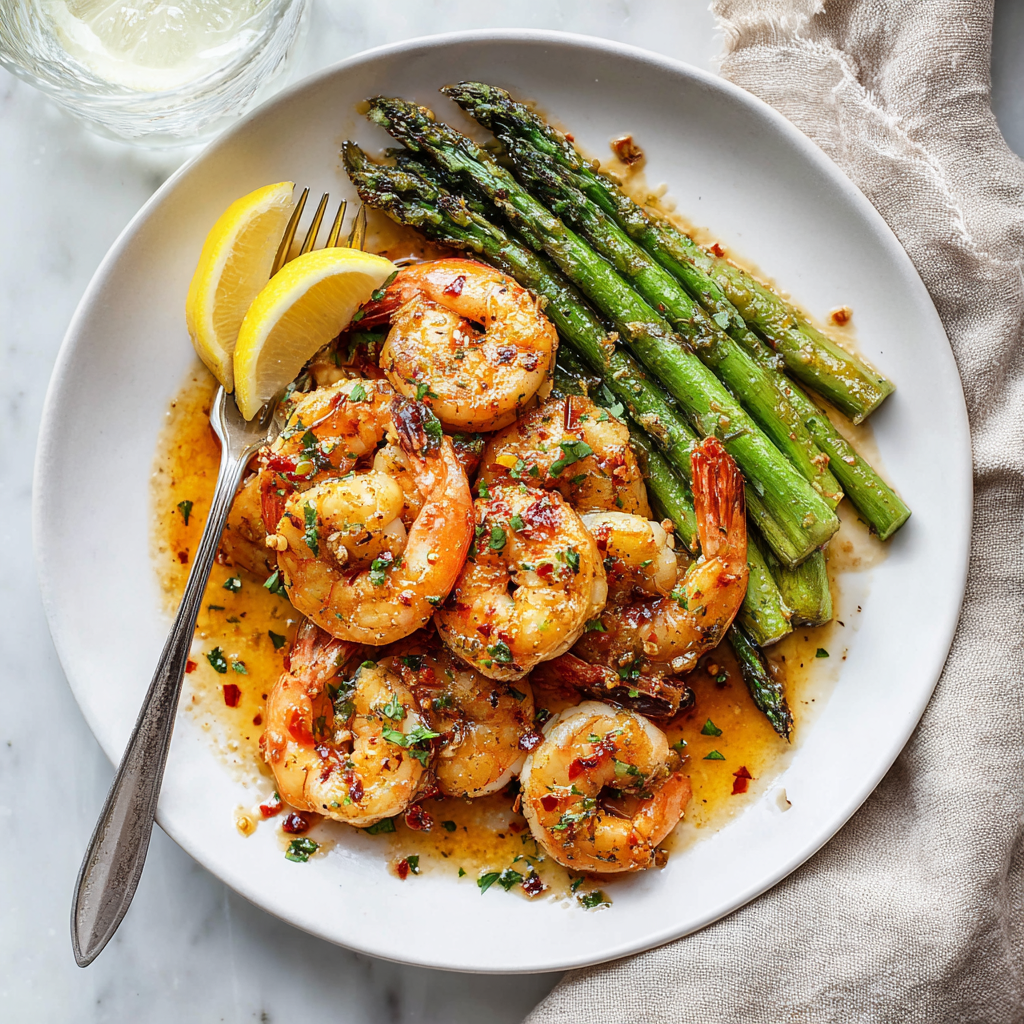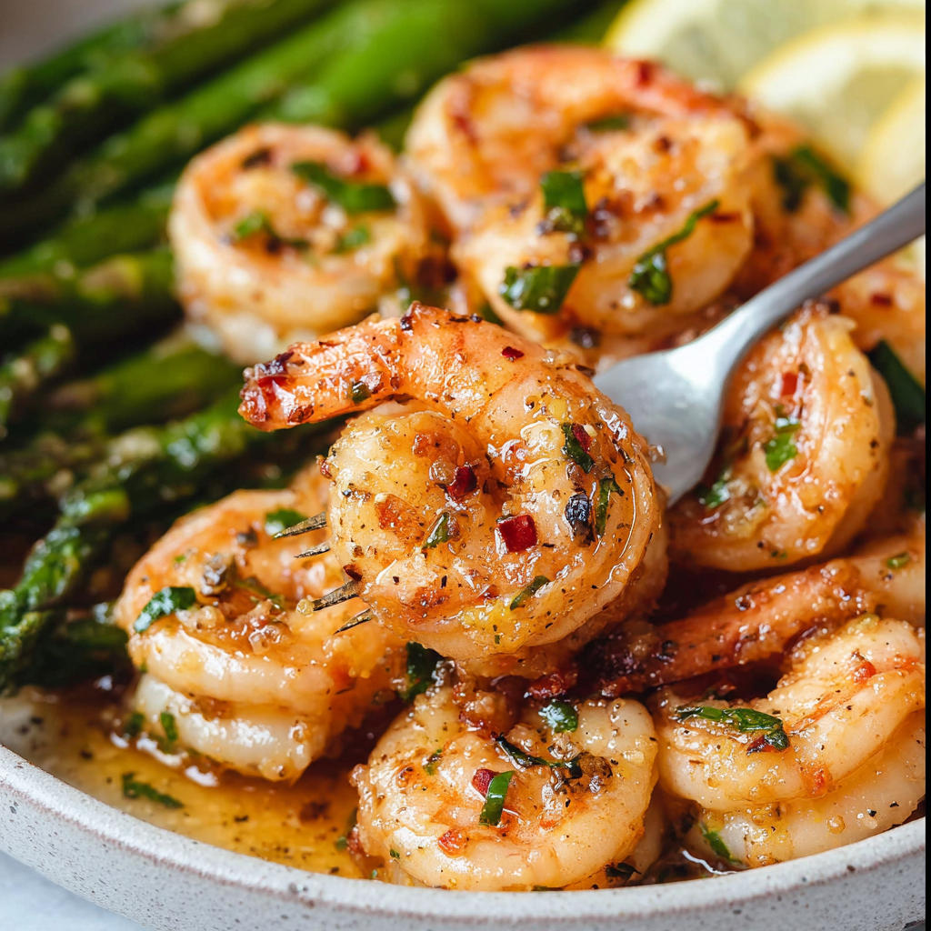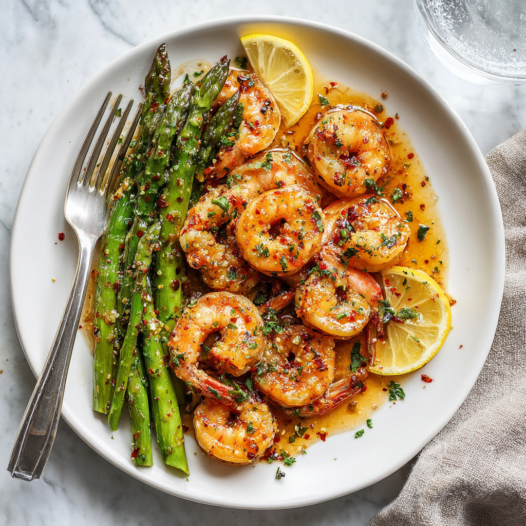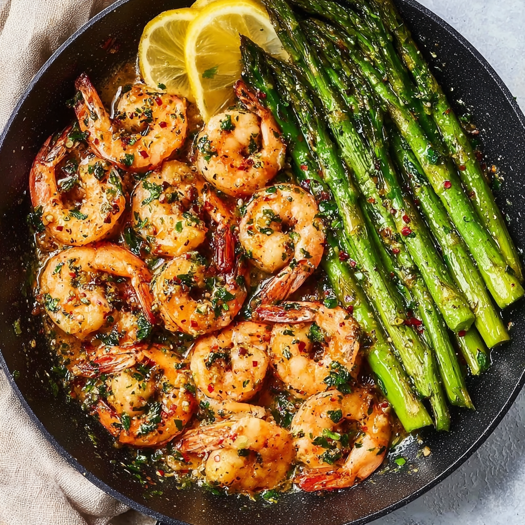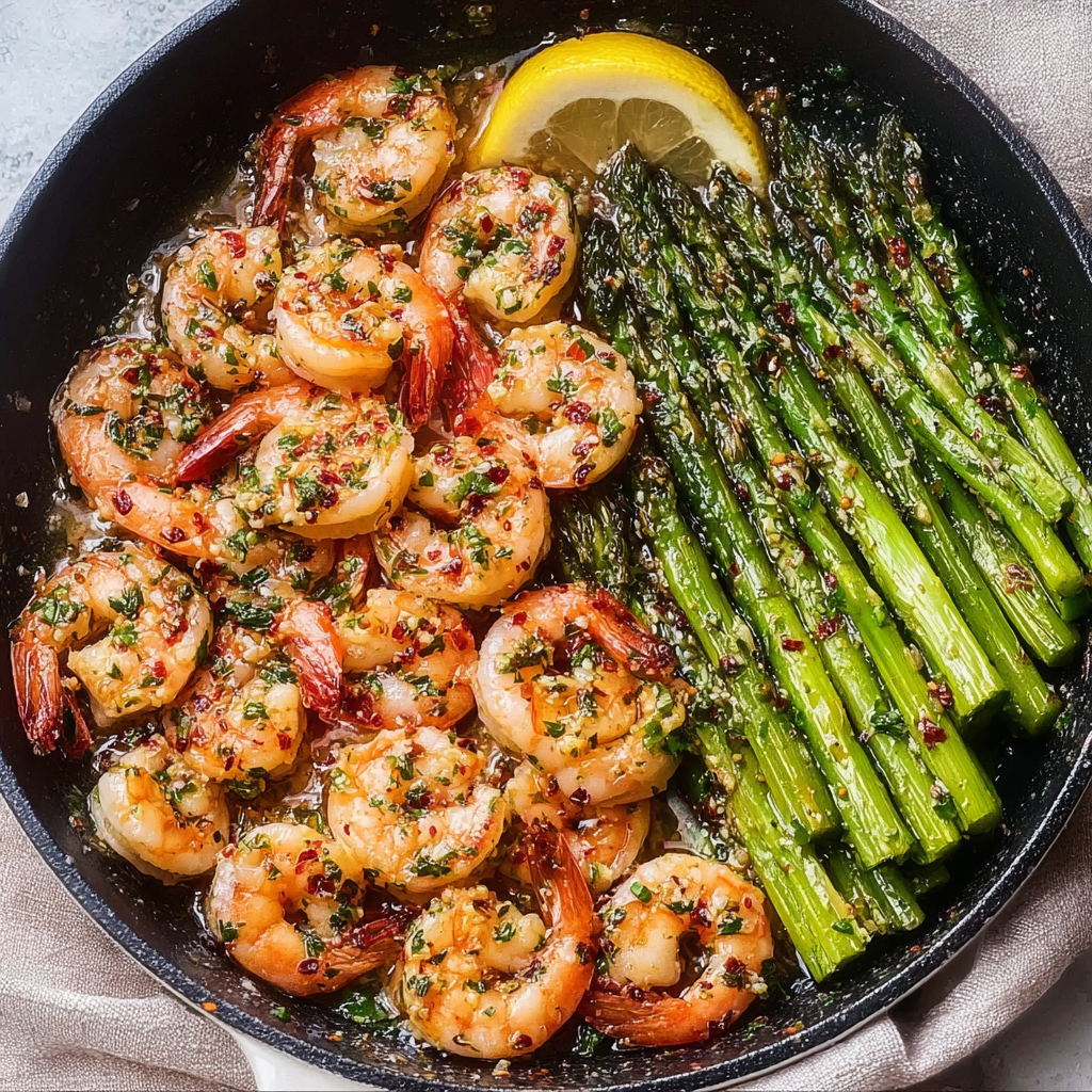 A quick stovetop meal where tender shrimp and crisp asparagus are cooked together in a rich garlic butter sauce with a hint of lemon and heat.