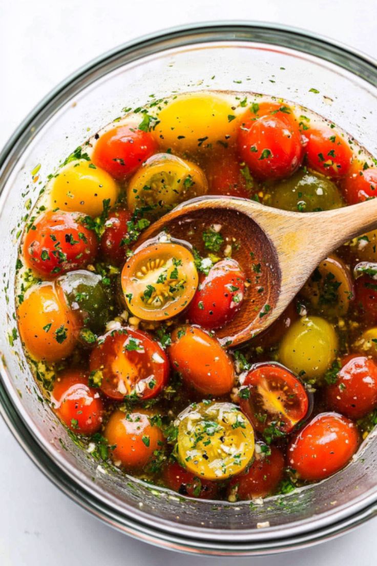 - Prepared Tomatoes – Halved cherry tomatoes for better absorption of the marinade.