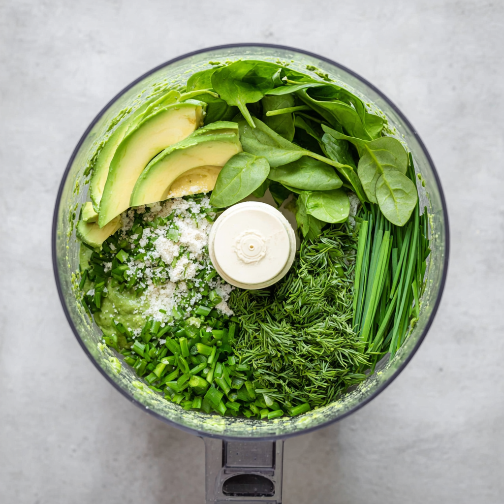 1. Add the yogurt, olive oil, avocado, lime juice, spinach, chives, parsley, green onions, garlic, basil, and salt to a blender or food processor.