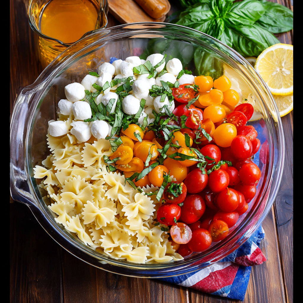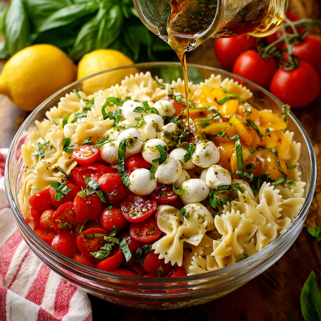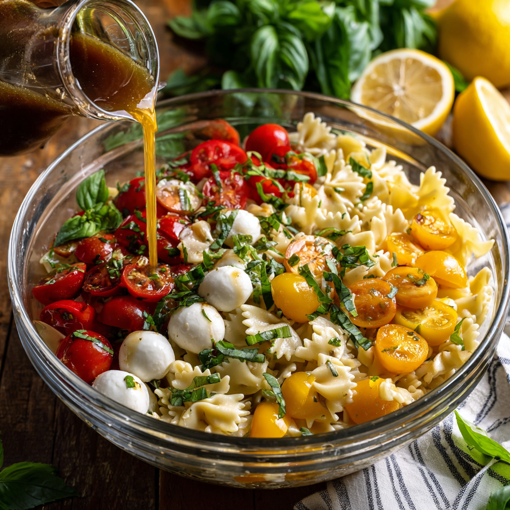- In a large mixing bowl, combine the cooled pasta, tomatoes, mozzarella, and basil. Pour the vinaigrette over the top and toss to coat evenly. Taste and adjust seasoning as needed. Serve right away.
