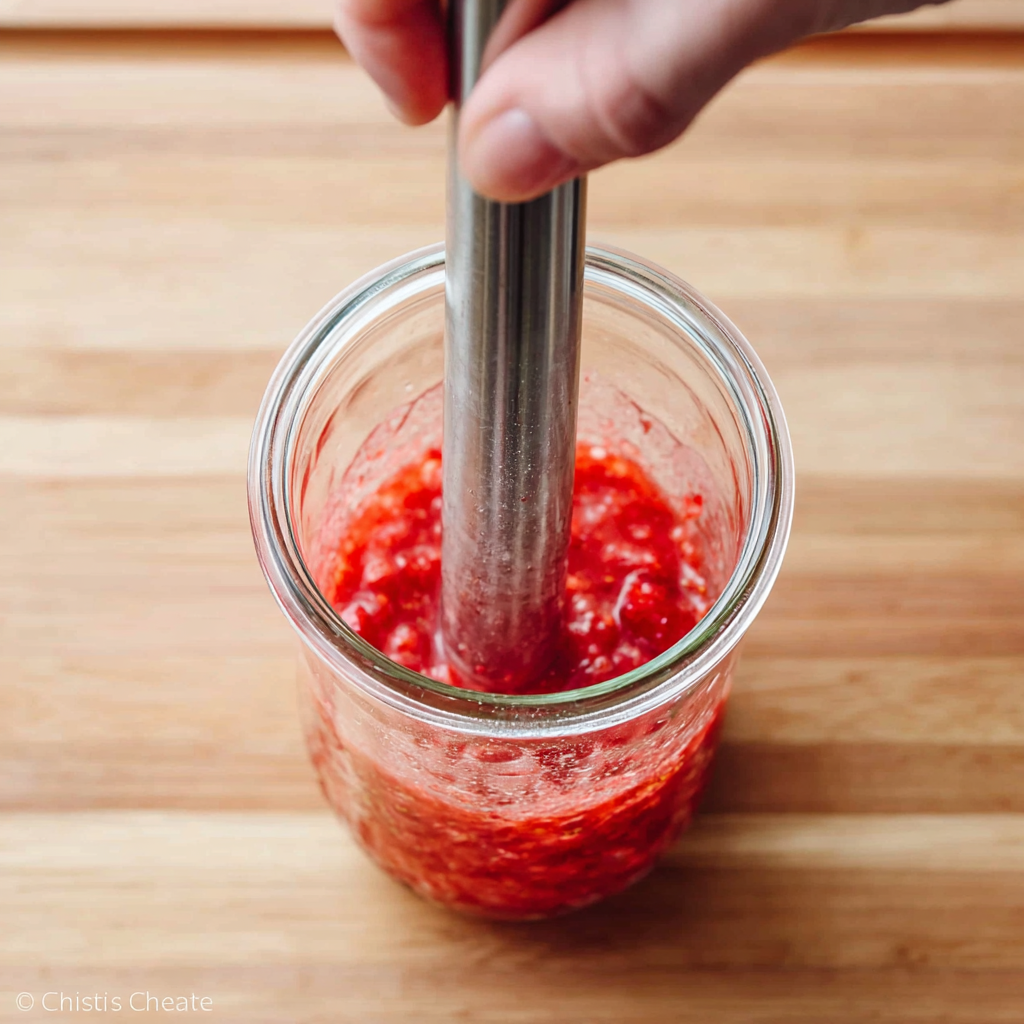 - Add the strawberries and sugar to a tall 16-oz drinking glass. Using a muddler, crush the strawberries until they release their juices and form a purée. (If you don't have a muddler, finely chop or purée them in a blender, then mix with the sugar in a glass).
