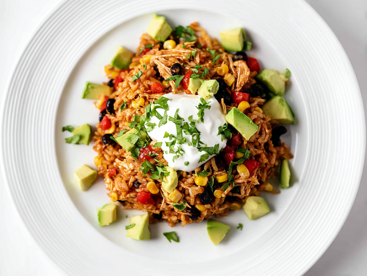 The rice soaks up all that seasoned broth, the chicken stays juicy, the beans make it hearty, and then you crown the whole thing with a blanket of melted Monterey Jack.