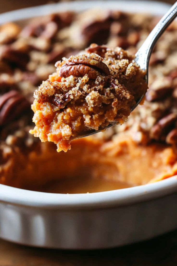 Fluffy, creamy sweet potatoes are topped with a golden brown sugar pecan crust — cozy, festive, and irresistible.