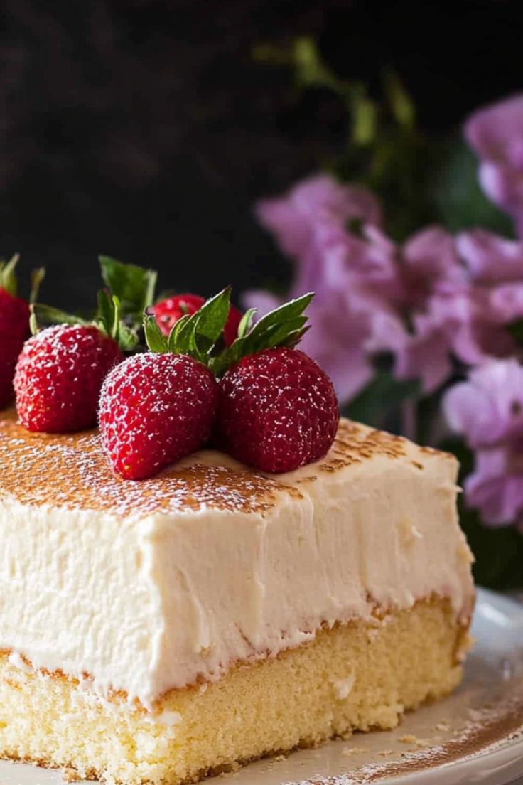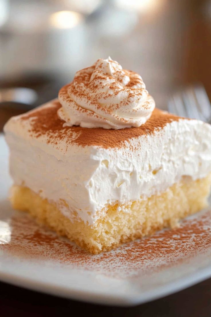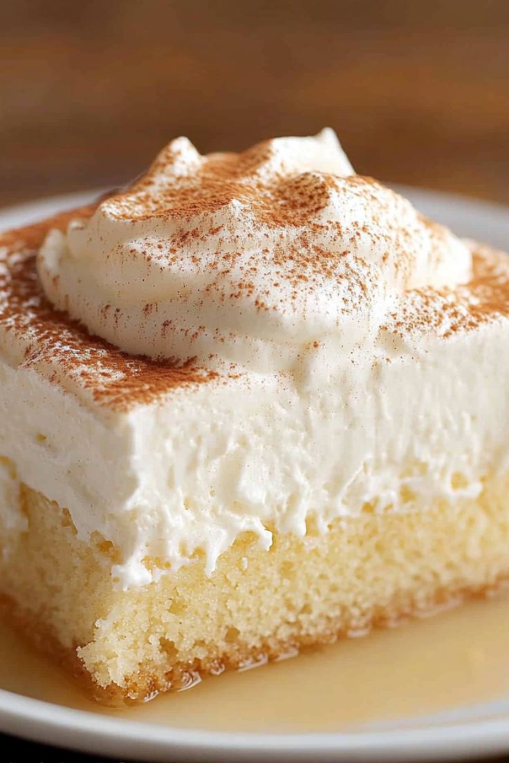 A classic Latin American dessert featuring a light, airy sponge cake soaked in a sweet three-milk mixture, then topped with fluffy whipped cream and cinnamon.